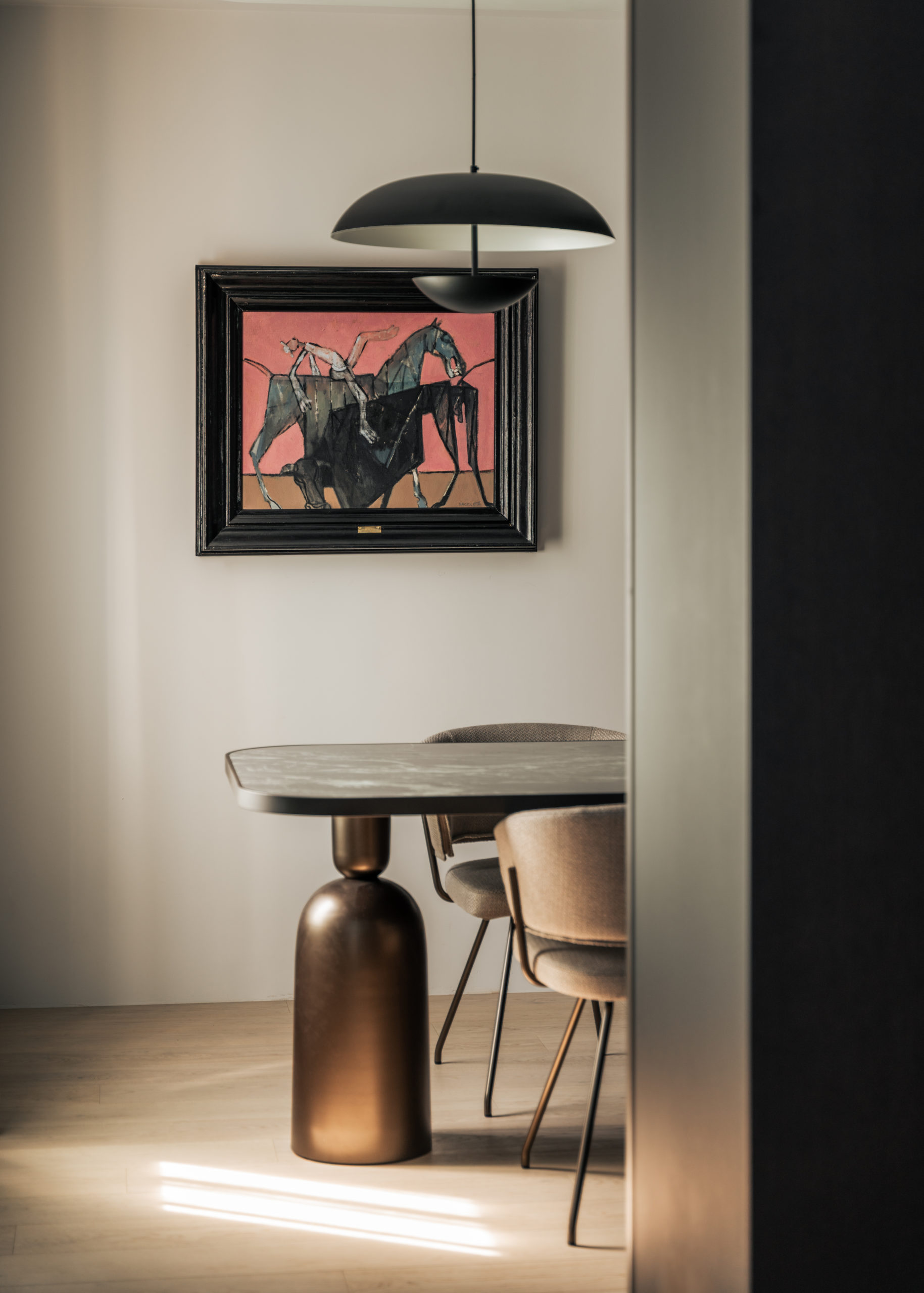 The larger apartment combines unconventional colors and materials—dark-stained oak veneer, a very light whitewashed oak floor, and a bold Verde Aver green marble finish. It includes two bathrooms: a private en-suite for the master bedroom, and a second one accessed via the utility room, which also serves the terrace with a hot tub and sauna. The main living space is zoned by a bespoke joinery element into several areas. The dominant zone upon entering is the living and dining area, anchored by a custom table by the Italian manufacturer Bonaldo. On one side, the kitchen is visually separated by a green island; on the other, two more intimate corners are created—a home office and a fireplace nook, complemented by brass shelves and an antiqued mirror.