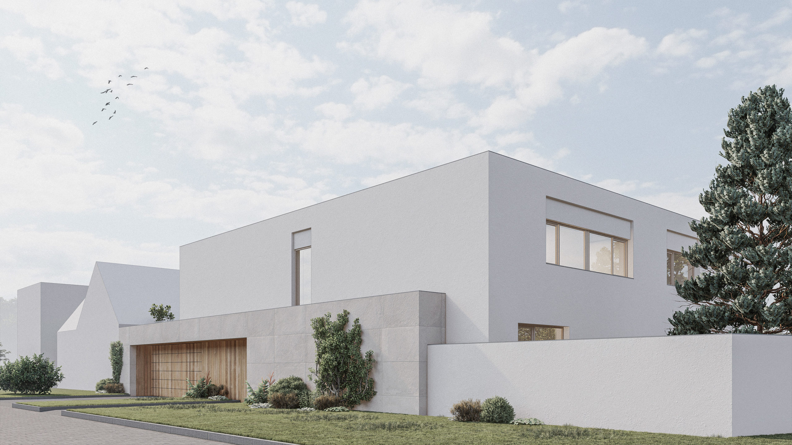 This two-storey family house design respects the existing surrounding buildings by aligning the frontage with the street line while opening the building up towards the garden. The floor plan reflects the surrounding development and the existing building. The U-shaped mass of the building creates a secluded atrium space with a terrace and greenery, seamlessly connecting to the living areas of the house. This creates an intimate part of the garden sheltered from the neighbours. The main portion of the house defines a separate section of the garden, which will be designated as a utility area. The morphology and design of the house takes inspiration from the current surrounding development and the demolished building, ensuring a cohesive streetscape. From the street view, the property is divided into the main house block and a lower garage building. Traditional family house functions are housed within the two-storey section, followed by the ground floor garage and smoothly transitioning into the wellness area. The ground floor features a spacious living room with an integrated kitchen and concealed pantry, a guest room, bathroom, dressing room, and utility room. There is also a large garage accessible from the entrance hall, which includes a seating area and offers access to additional storage space. Behind the garage, there is a separate study with its own facilities. The principal areas on the ground floor are designed to embrace the residential atrium, with generous glazed areas ensuring maximum connectivity to the outdoors. Beyond the study, a separate wellness area offers amenities such as a jacuzzi, sauna, and ample relaxation spaces both inside and outside the building. The second level is dedicated to privacy, featuring large ensuite bedrooms with walk-in closets and additional rooms. These spaces have access to a terrace situated on the roof of the garage, providing an outdoor retreat for the residents.