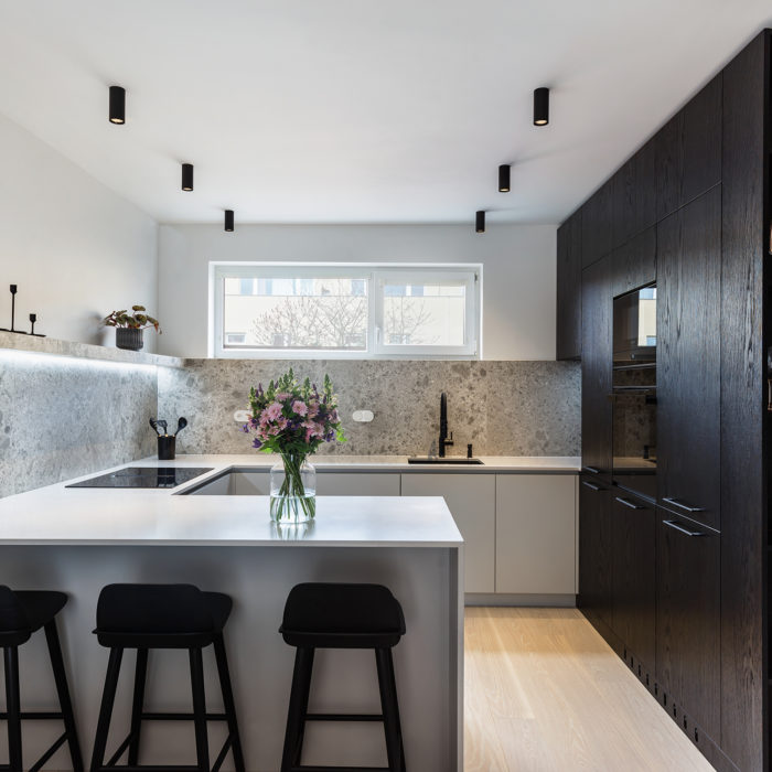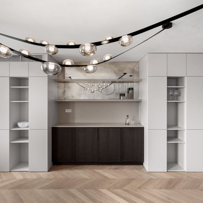 The master bedroom, overlooking a serene courtyard, boasts a newly designed private bathroom and a walk-in closet. The interior concept revolves around a timeless palette, combining dark stained oak veneer, dark oak flooring, and white woodwork elements, accented with metallic details. Walls throughout the apartment are designed to showcase the client’s extensive art collection. The interior design employs details such as decorative mouldings, and rosettes. The choice of materials and design details pays homage to the age of the house and its location in the heart of Prague’s historic centre.