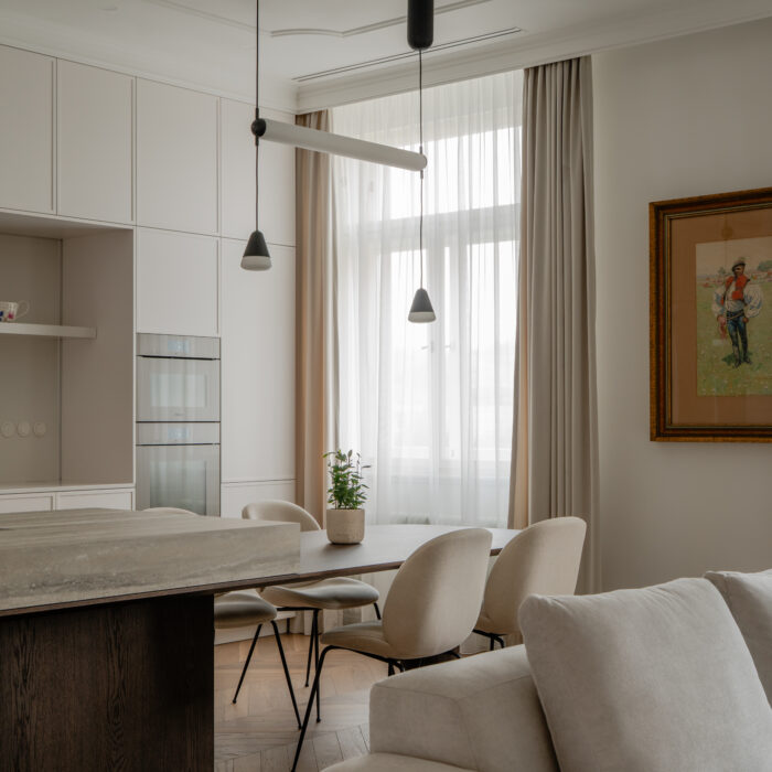 The project is a design of the comprehensive renovation of a flat at Rašínovo nábřeží, tailored to meet the contemporary needs and preferences of the clients. This includes minor layout adjustments and reconfiguration into a layout comprising four rooms and a kitchenette. Central to the apartment is a stylish entrance hall featuring meticulously crafted storage solutions. The spacious living room, with its uniquely designed kitchen island doubling as a dining table, serves as the focal point. A charming bay window element creates a cosy nook in the living area. We took the decision that the living room faces the main street.