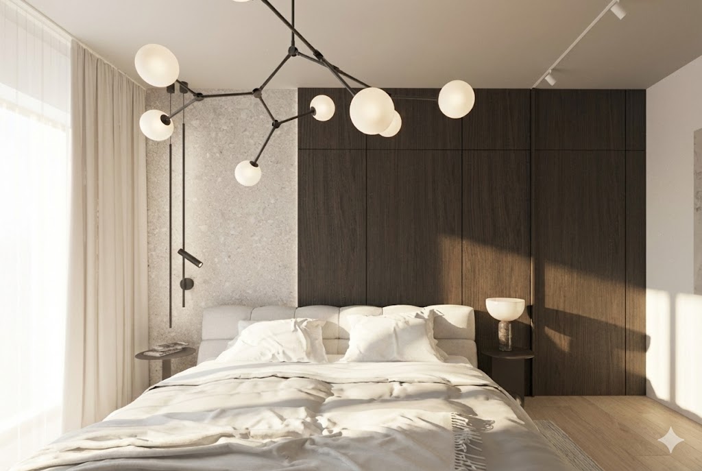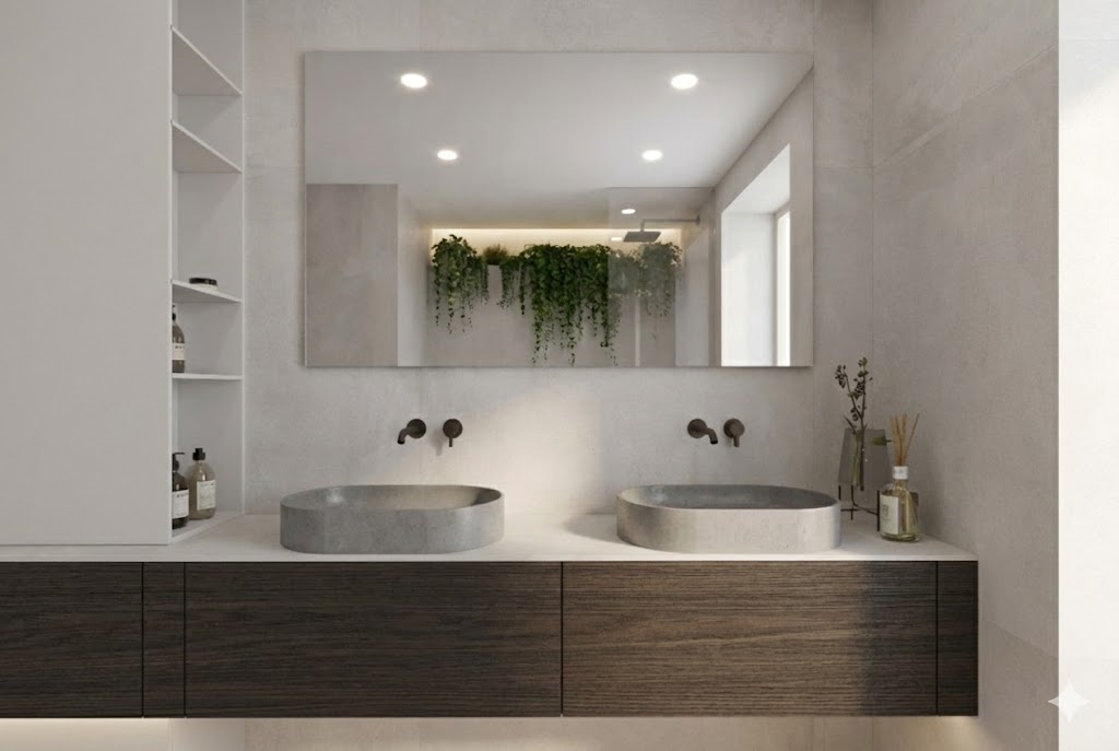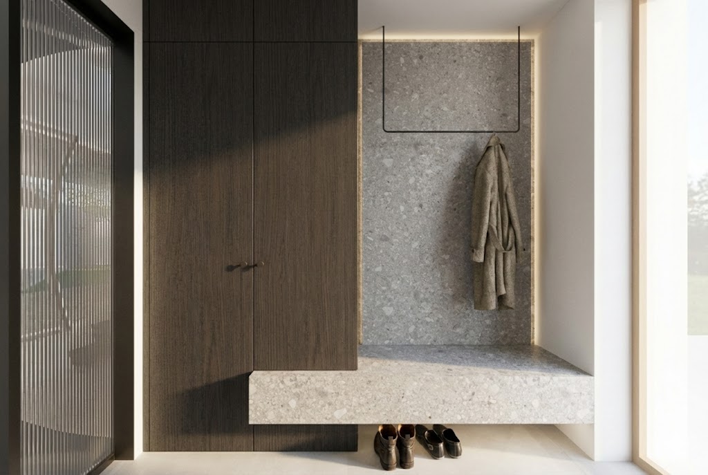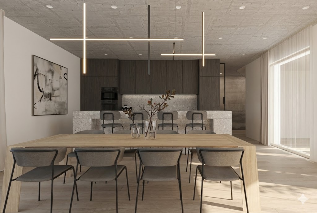 The layout of the house is divided into a two-storey residential section and an adjoining single-storey wing with a garage, which seamlessly transitions into the wellness area. The ground floor is dedicated to an open-plan living space with a kitchen and dining area, complemented by a guest room, bathroom, walk-in wardrobe, technical/utility facilities, and storage areas. The second floor is conceived as purely private—featuring the master bedroom with its own dressing room and bathroom, as well as three additional rooms. Both the rooms and the master bedroom have a direct connection to the roof terraces above the garage.