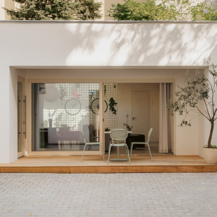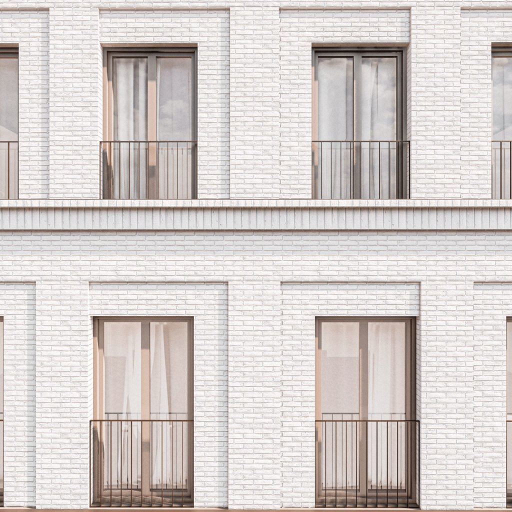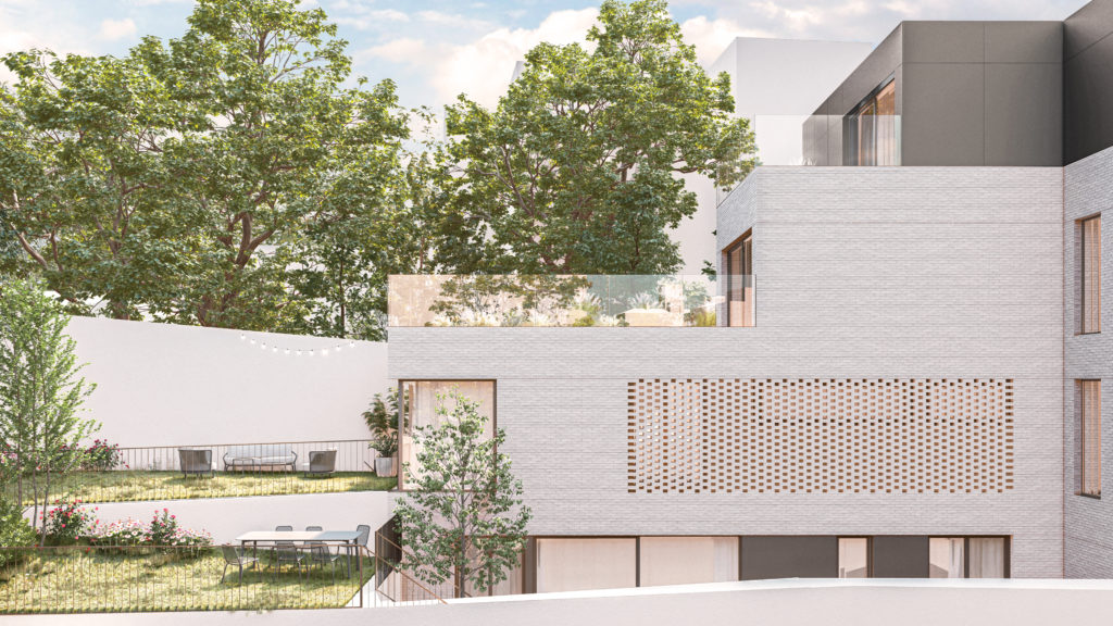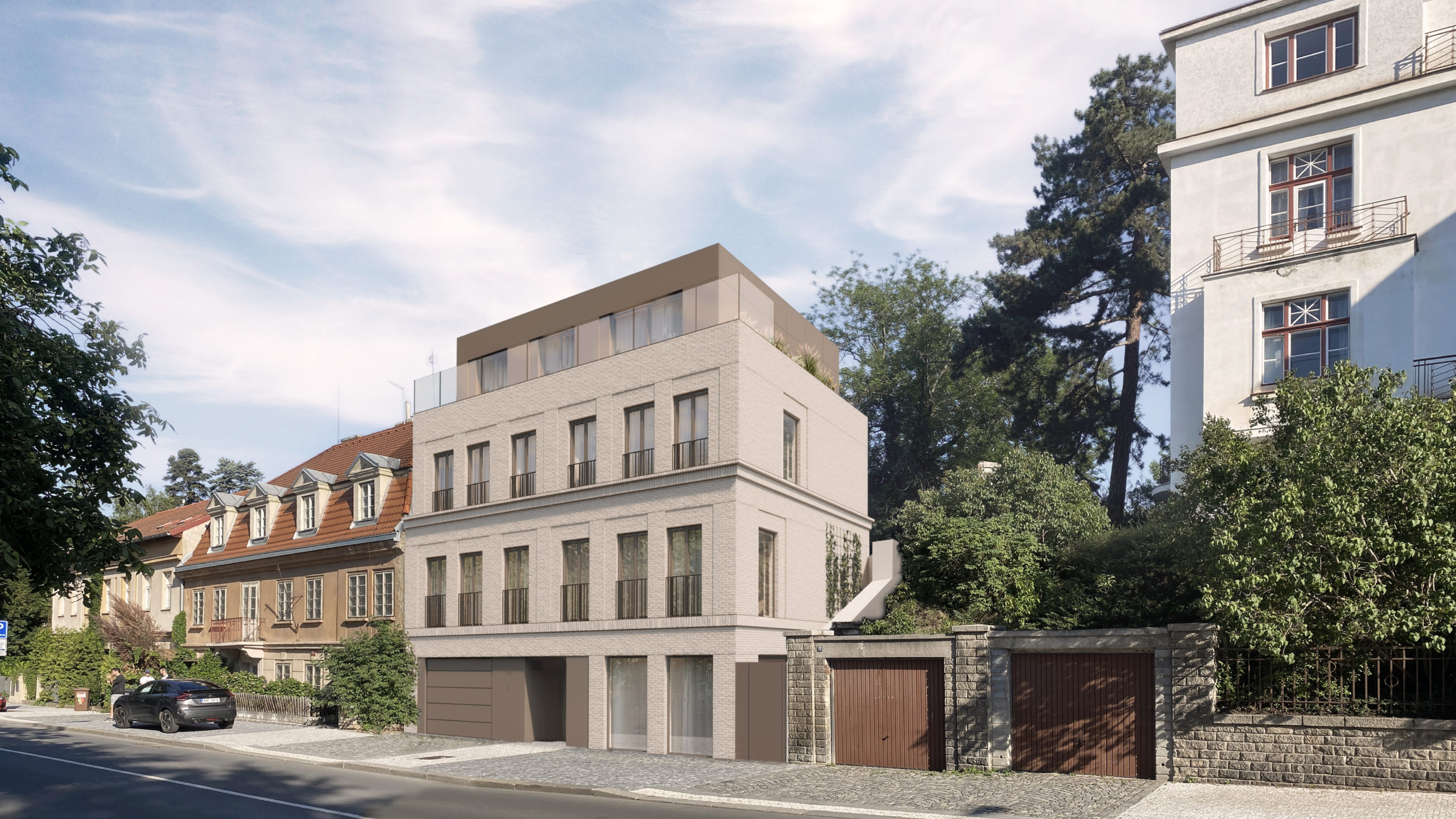 Fasádu tvoří světlé cihly doplněné oplechováním ustoupeného podlaží a garáže. Jednoduchá hmota je vyvážena precizními detaily a měřítkovým členěním, které reaguje na kontext okolí. Návrh byl výrazně ovlivněn omezeními – od požadavků na parkování až po umístění v ochranném pásmu památkové zóny a specifické vztahy k sousedním parcelám. Celek tak představuje soudobou architekturu citlivě zasazenou do komplikovaného prostředí.