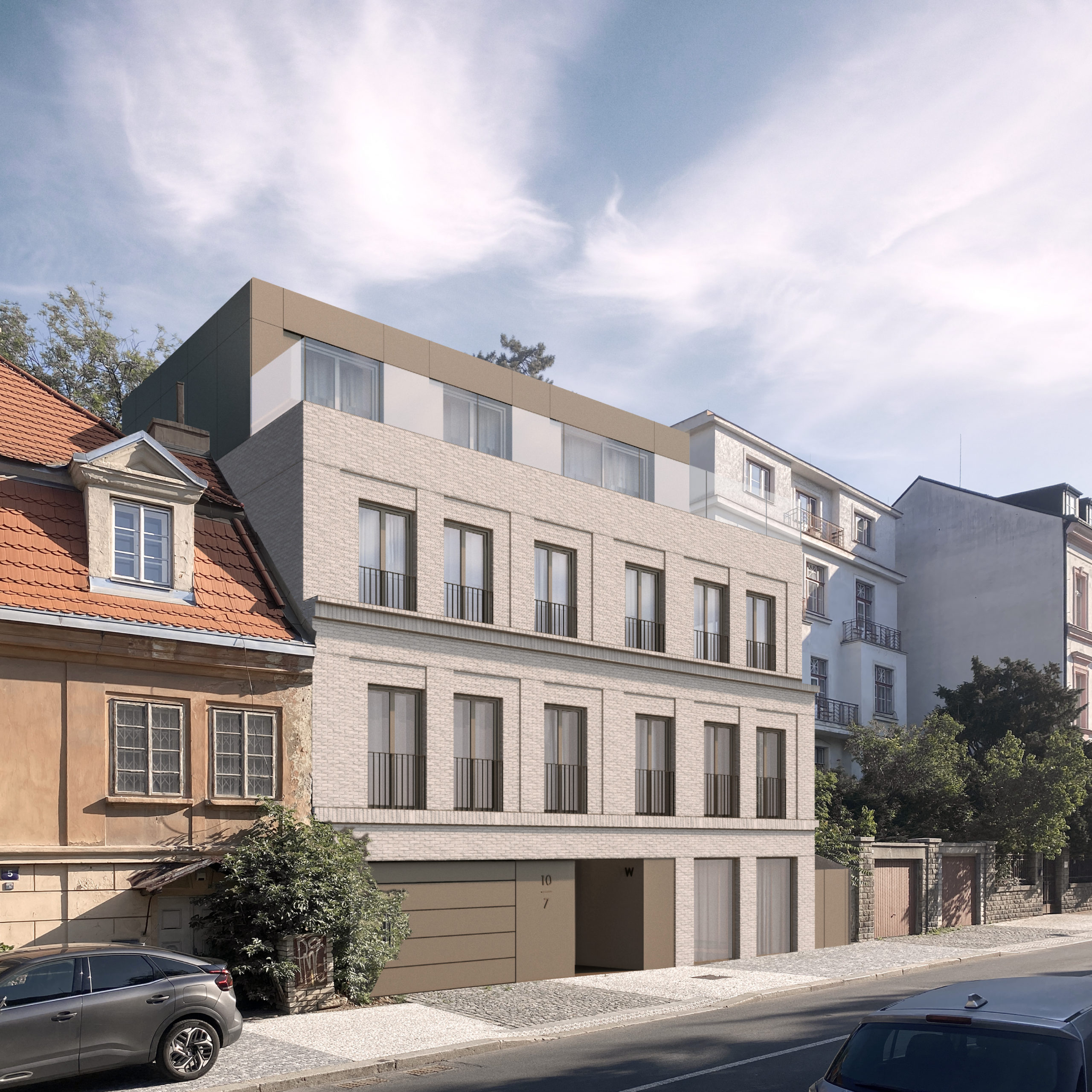 Návrh bytového domu o pěti jednotkách v Praze 6 vyplňuje proluku v ulici Wolkerova, která byla v minulosti zastavěná. Stavba se nachází v městském prostředí s různorodou zástavbou a svým objemem i výrazem reaguje na charakter místa. Jednotlivá podlaží jsou lehce ustoupená, aby dům nepůsobil těžkopádně a přirozeně zapadl do uliční fronty. Důraz byl kladen na symetričnost přední fasády, na navázání na historickou okolní zástavbu a na to, aby měl každý byt svůj vlastní venkovní prostor v podobě terasy.
