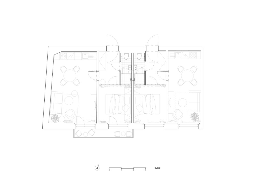 Rekonstrukci bytů s ikonickým výhledem na Grandhotel Pupp jsme pojali jako setkání historie s moderním životem. Velkorysý původní byt jsme rozdělili na tři samostatné jednotky – dvě prostorné 2kk a jednu útulnou 1kk – které dnes slouží jak pro krátkodobé návštěvy, tak i pro delší pobyty. Navrátili jsme se tak k původní dispozici, objekt sloužil jako depandance pro zmiňovaný Grandhotel Pupp. Každý detail jsme navrhli tak, aby uživatelům poskytl plnohodnotné zázemí, a přitom zůstal věrný původnímu duchu místa. Skleněné příčky se subtilním rámováním přinášejí do ložnic i chodeb více světla a při vstupu do apartmánů otevírají výhled na Grandhotel Pupp. Autenticitu interiéru podtrhují repasovaná svítidla, ponechaný dobový nábytek a oškrábané omítky, které odkryly dekorační válečkované nátěry. Parketové dřevěné podlahy odkazují na tradiční historické skladby. Repasované dveře s mosazným kováním a nově vybudované koupelny v moderním standardu propojují minulost s přítomností. Výsledkem je prostor, který má duši – a který si vás získá hned při prvním otevření dveří.
