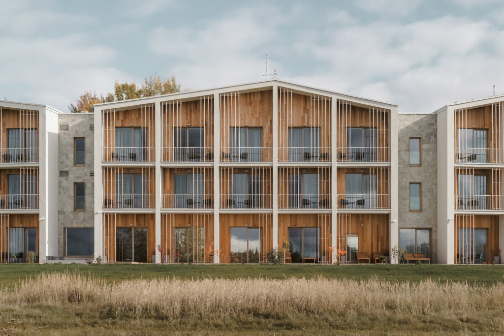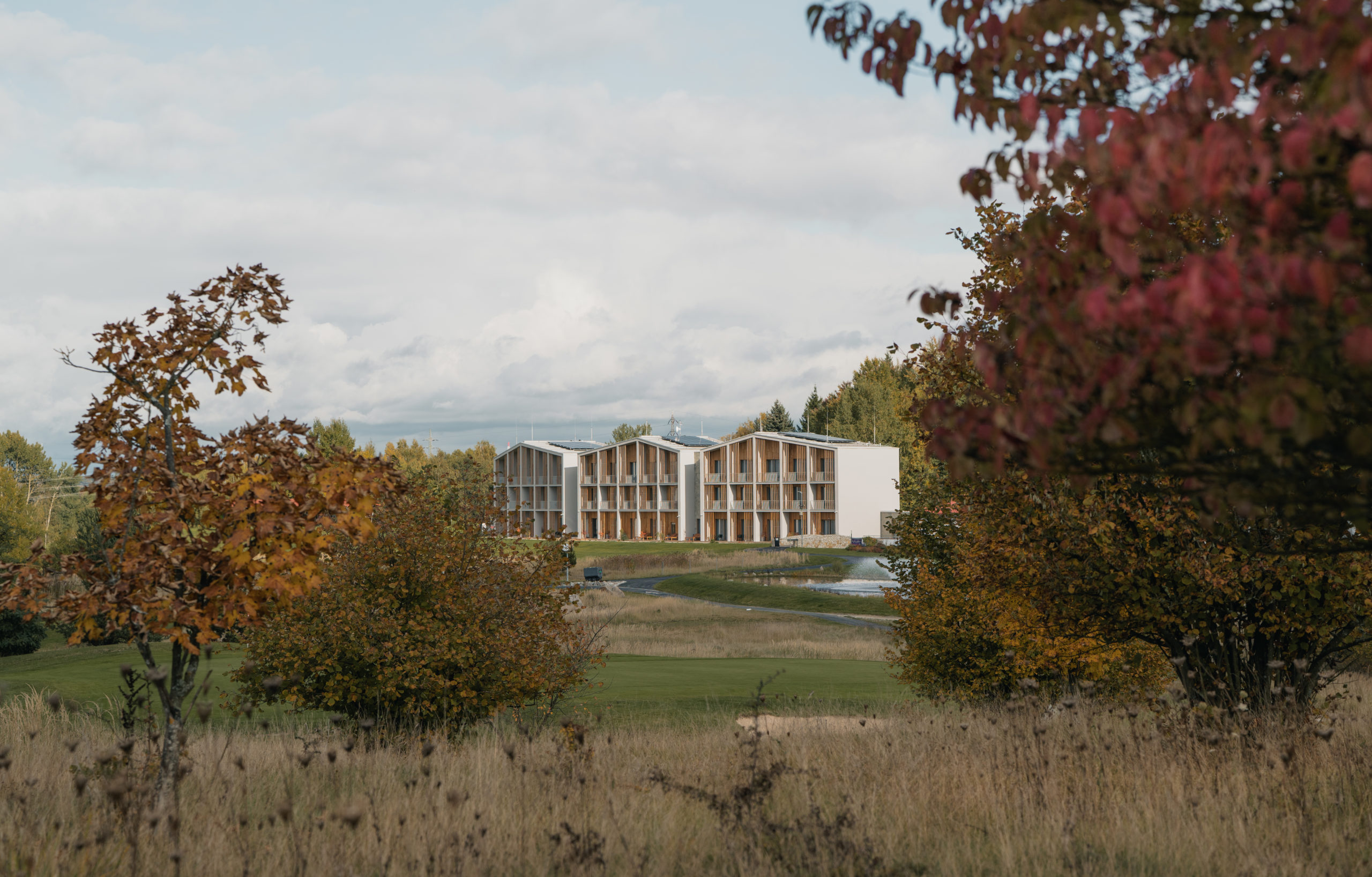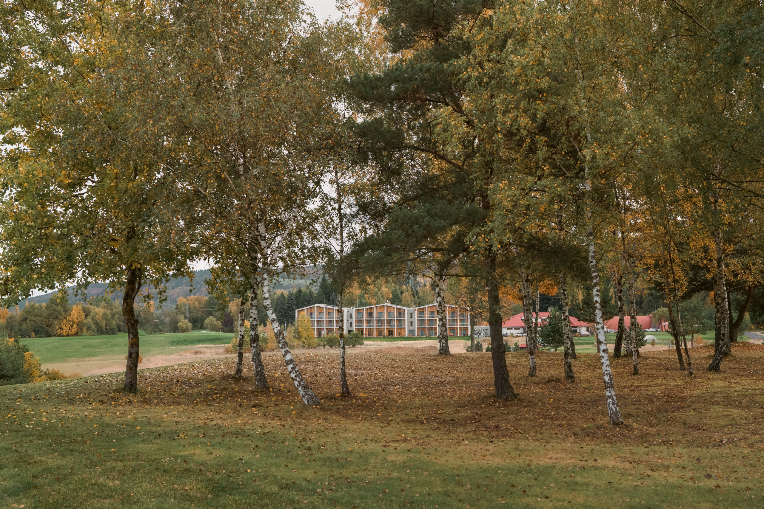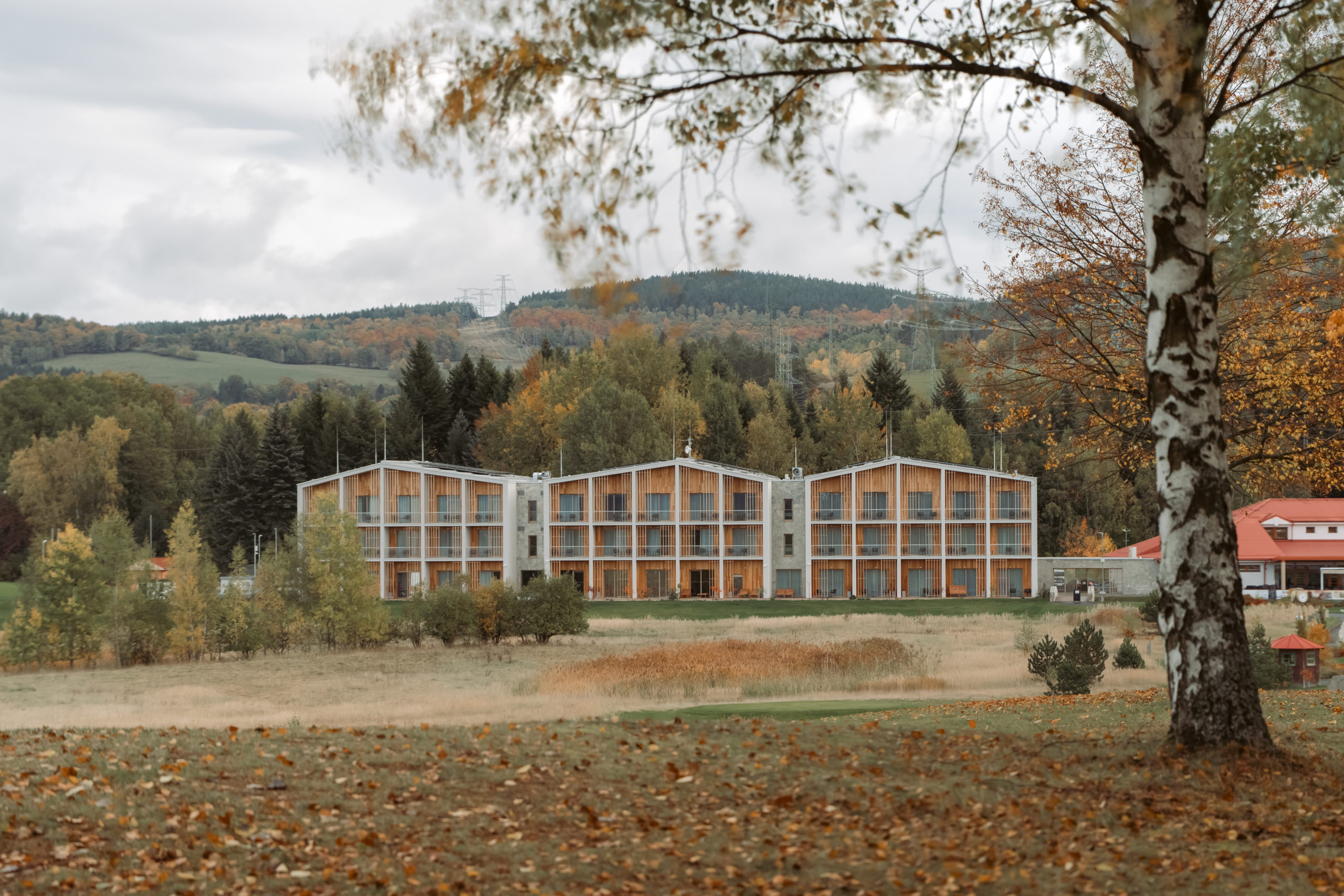 Golfový hotel v Sokolově svým návrhem přirozeně navazuje na okolní krajinu. Tři vzájemně propojené objekty kopírují tvar potoka, čímž plynule propojují golfové hřiště s hotelovou částí. Každý z objektů má sedlovou střechu a fasádu z červeného cedru, doplněnou kamenným obkladem, který odkazuje na místní materiál.