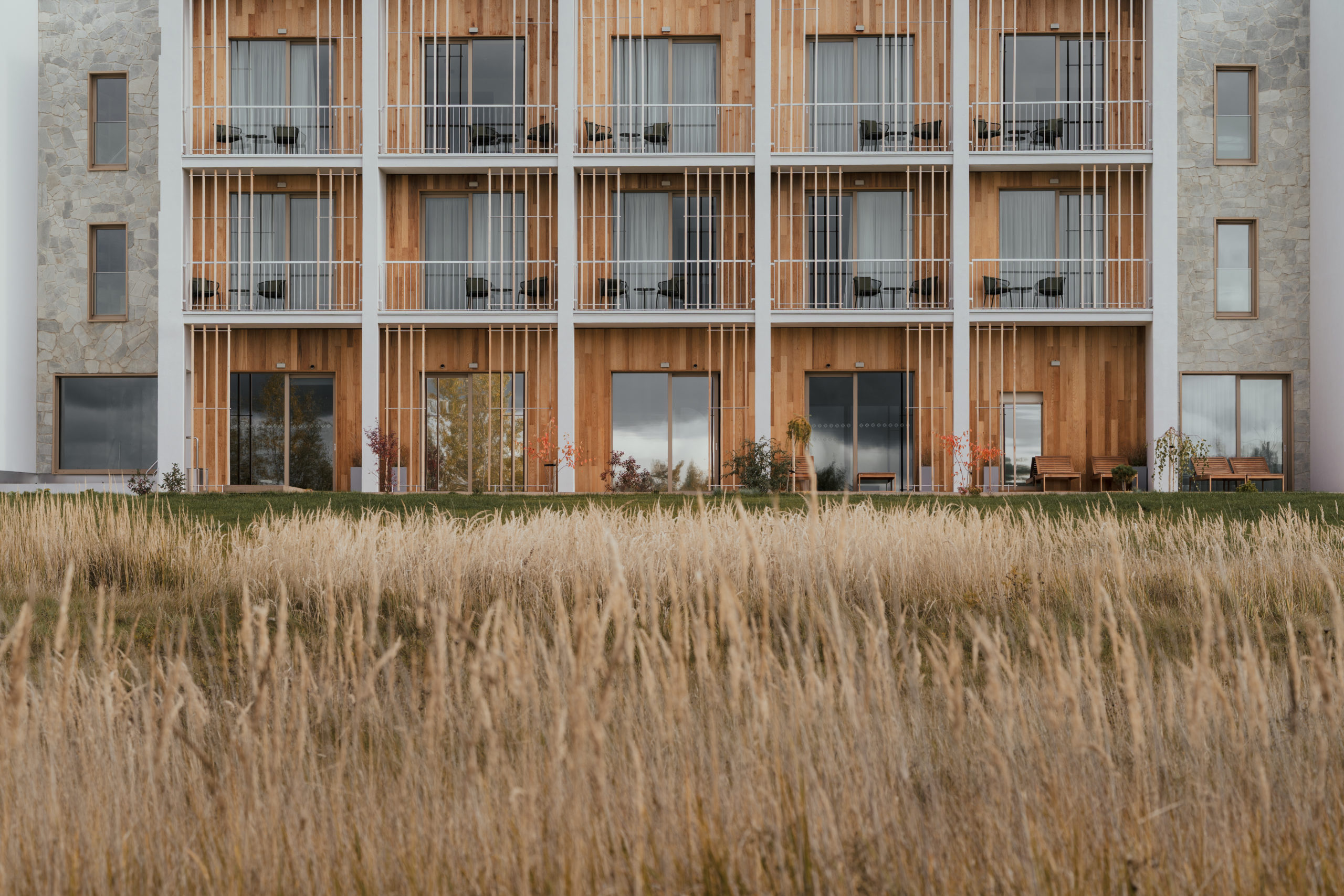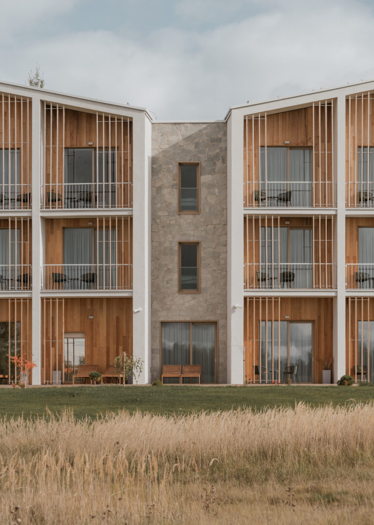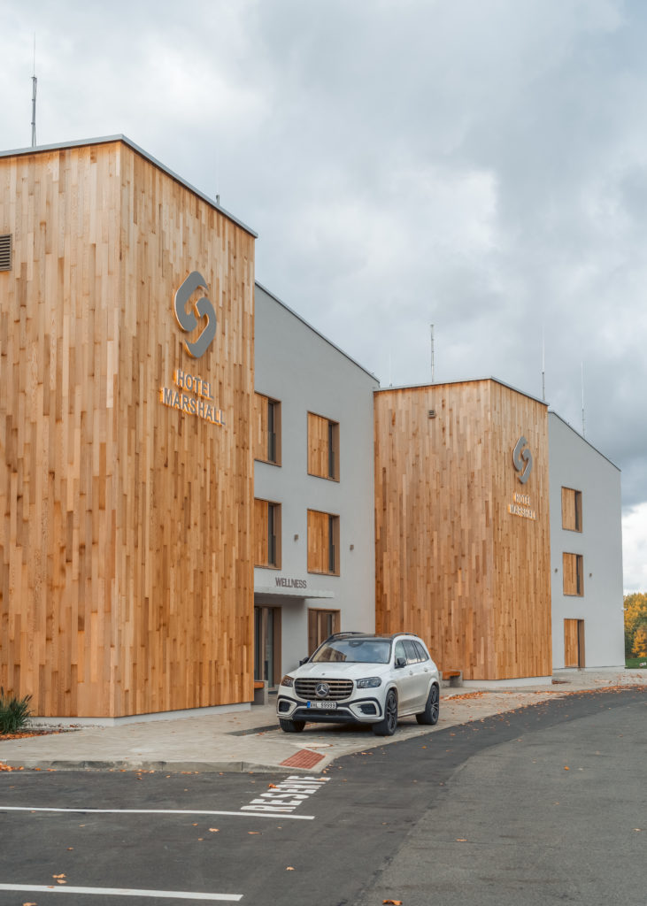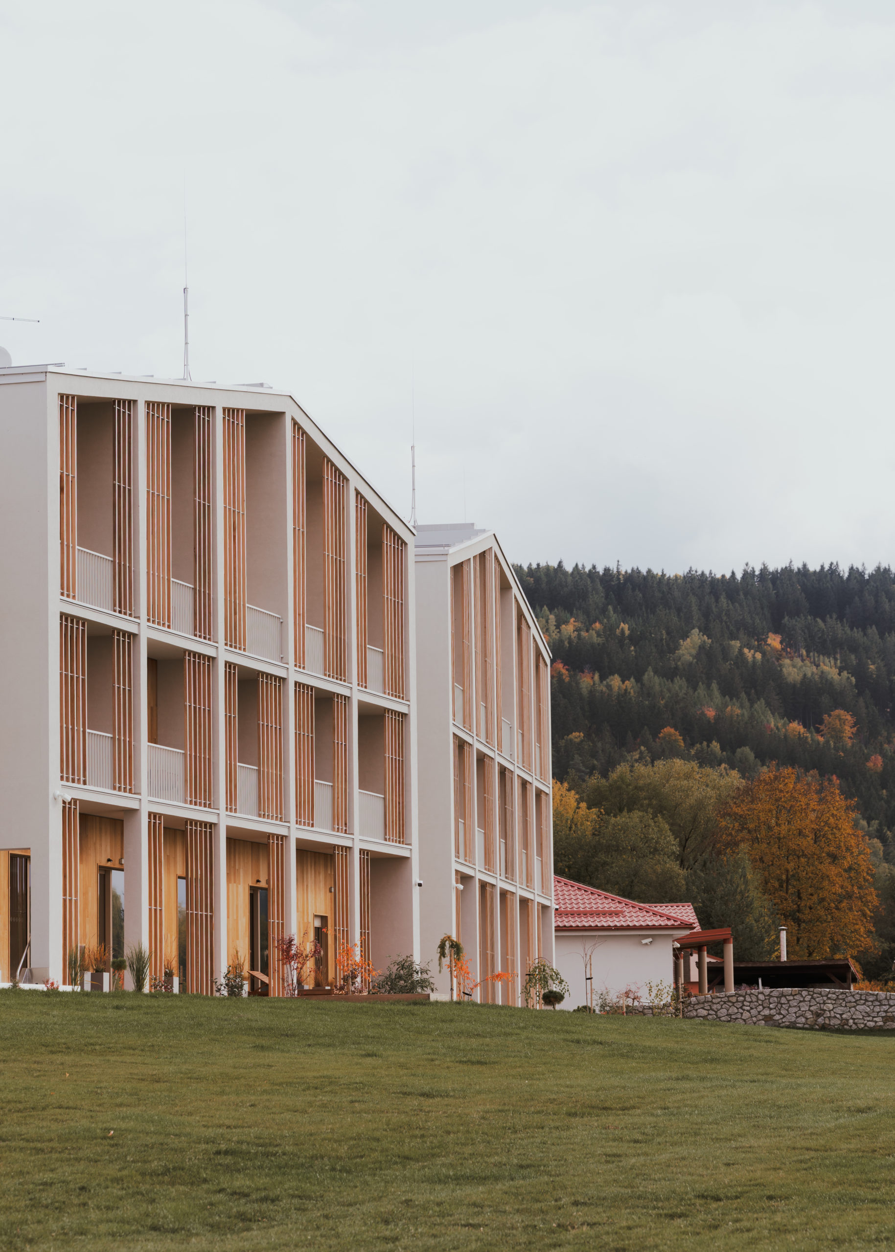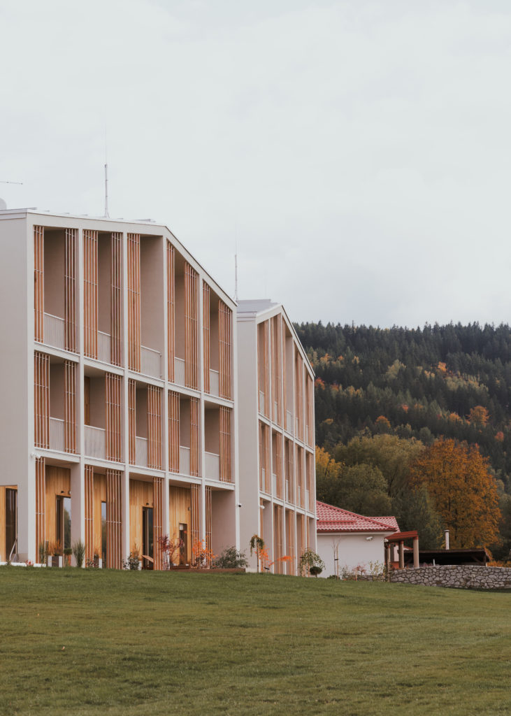 Golfový hotel v Sokolově svým návrhem přirozeně navazuje na okolní krajinu. Tři vzájemně propojené objekty kopírují tvar potoka, čímž plynule propojují golfové hřiště s hotelovou částí. Každý z objektů má sedlovou střechu a fasádu z červeného cedru, doplněnou kamenným obkladem, který odkazuje na místní materiál.