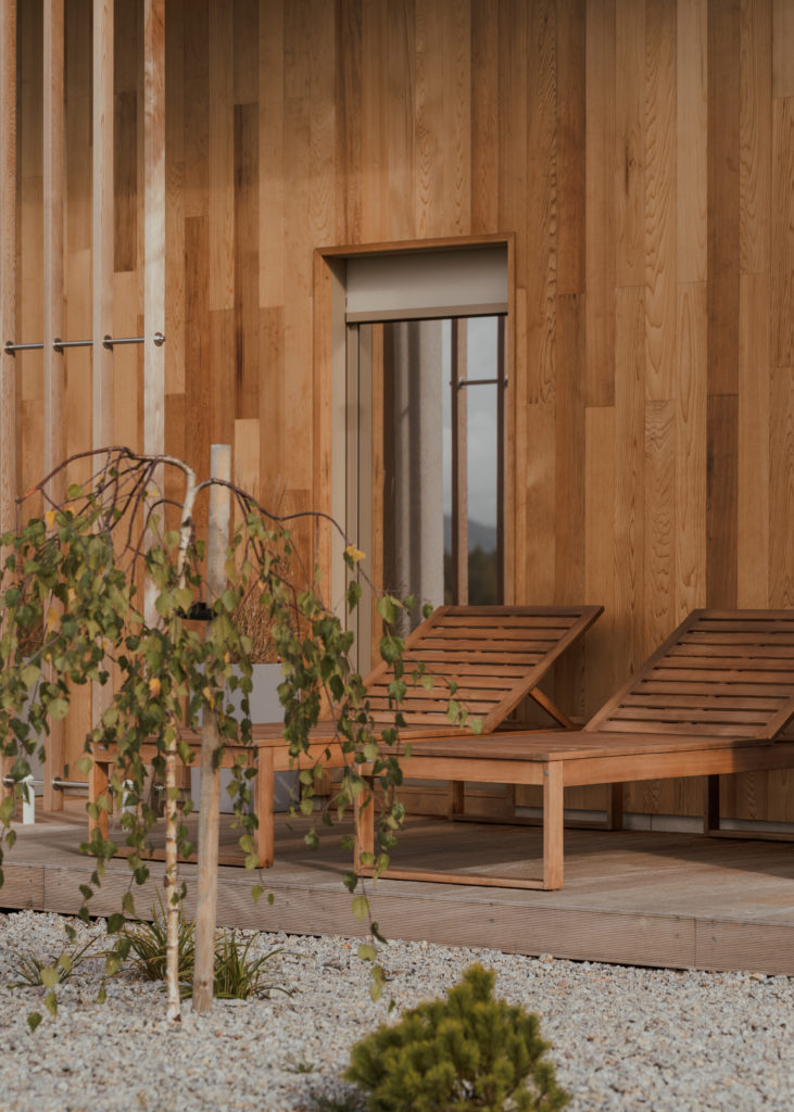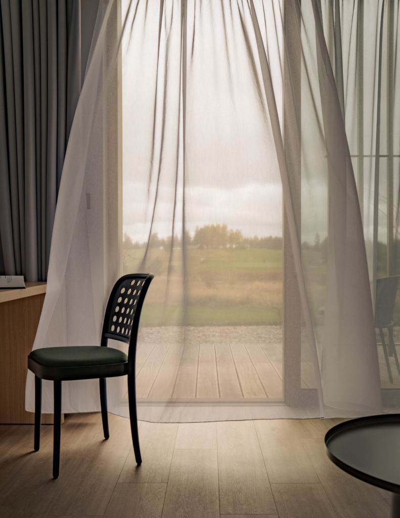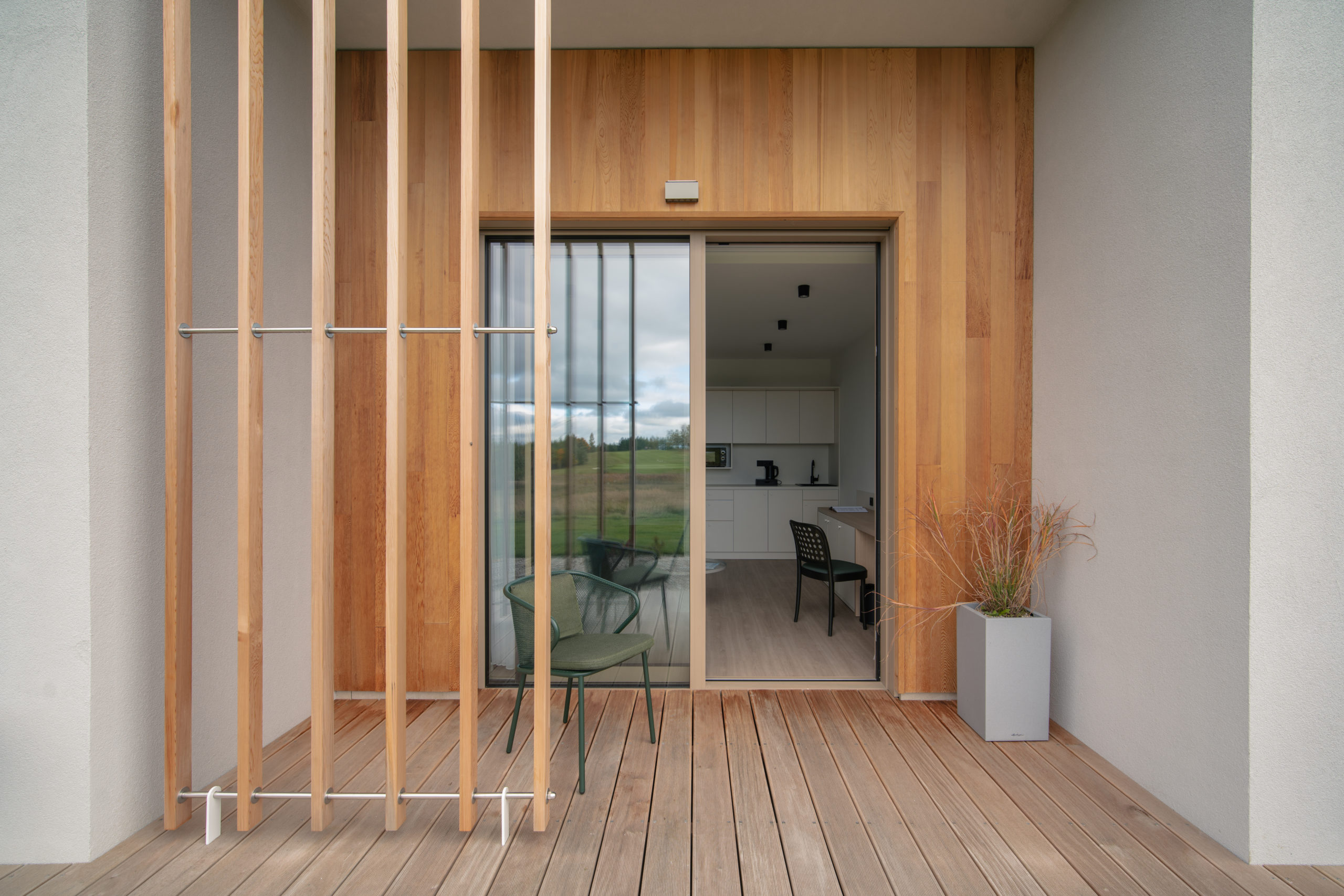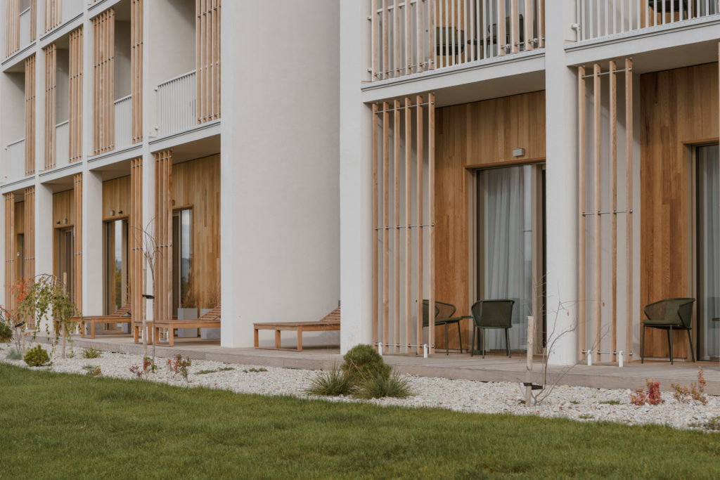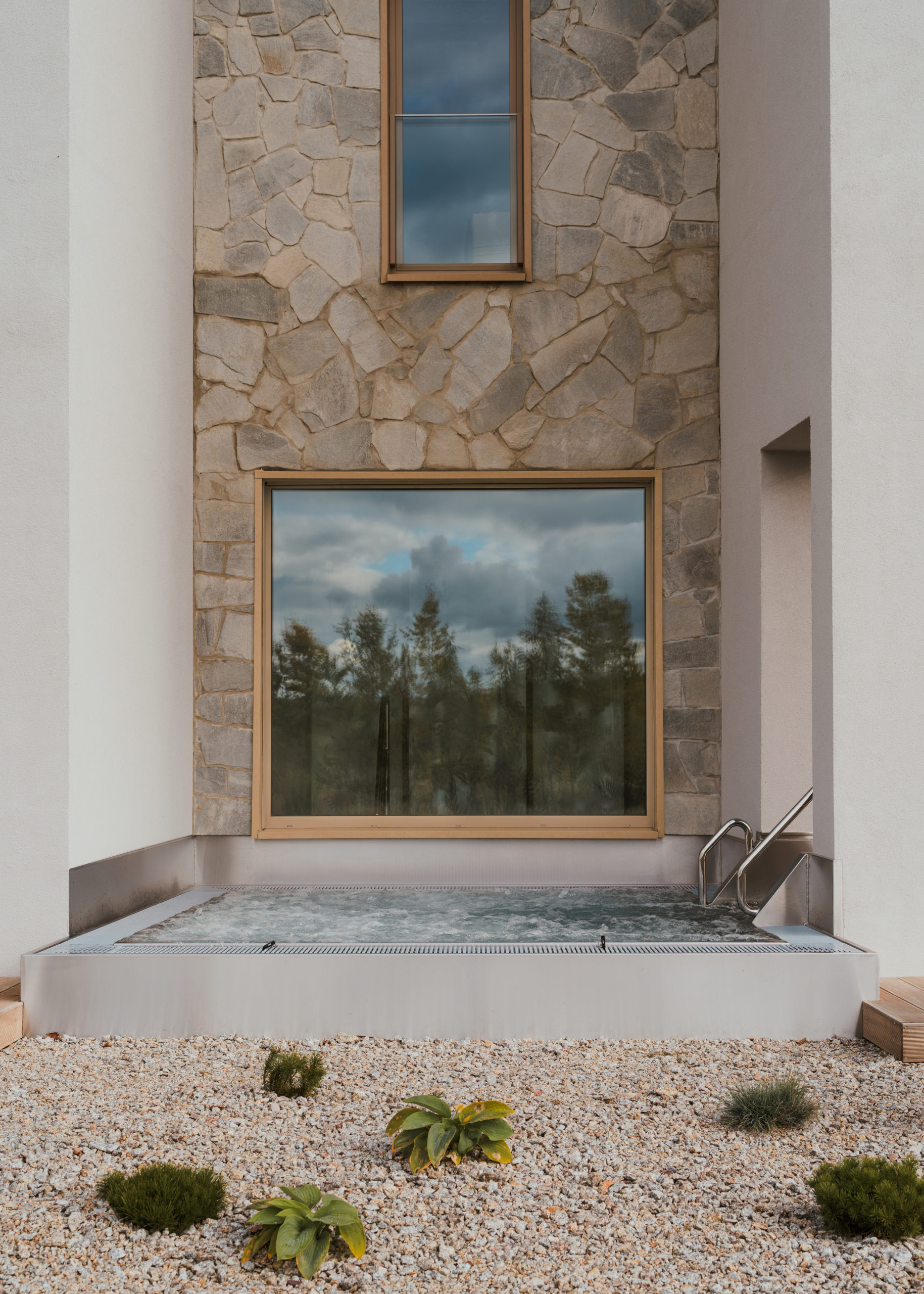 Golfový hotel v Sokolově svým návrhem přirozeně navazuje na okolní krajinu. Tři vzájemně propojené objekty kopírují tvar potoka, čímž plynule propojují golfové hřiště s hotelovou částí. Každý z objektů má sedlovou střechu a fasádu z červeného cedru, doplněnou kamenným obkladem, který odkazuje na místní materiál.