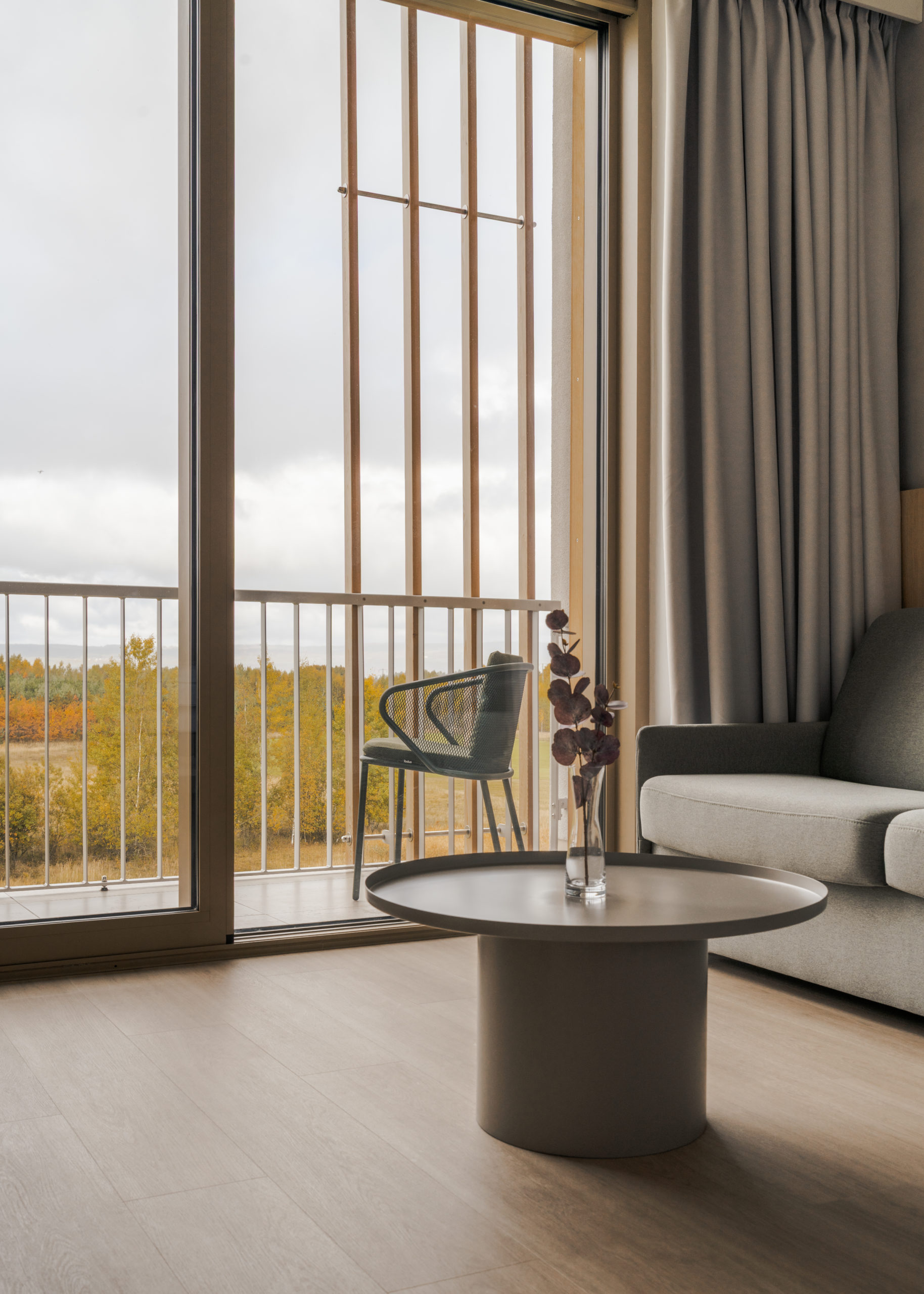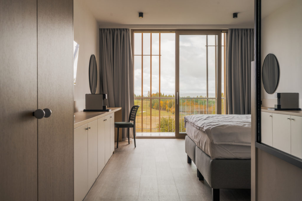 Interiér kombinuje standart komfortního hotelu s uvolněnou atmosférou sportovního prostředí. Všechny pokoje i společenské prostory jsou orientovány na hřiště a využívají přírodní materiály, jemnou barevnost a promyšlené osvětlení. Ubytovací část doplňuje skromná wellness zóna, která podporuje celkový komfort. Navíc je šetrnost provozu vytvořena za pomocí energeticky úsporného systému vytápění, chlazení a rekuperace.