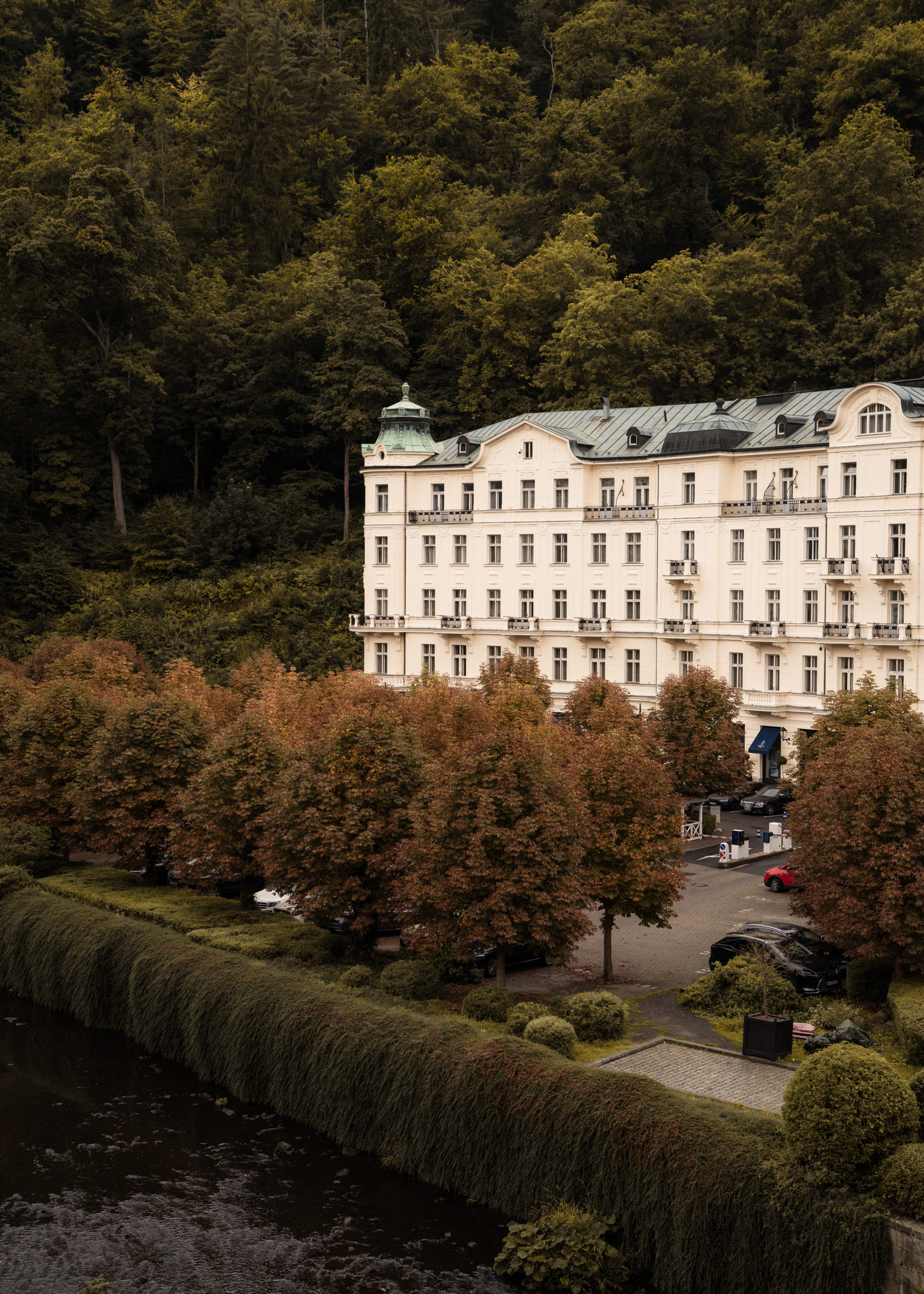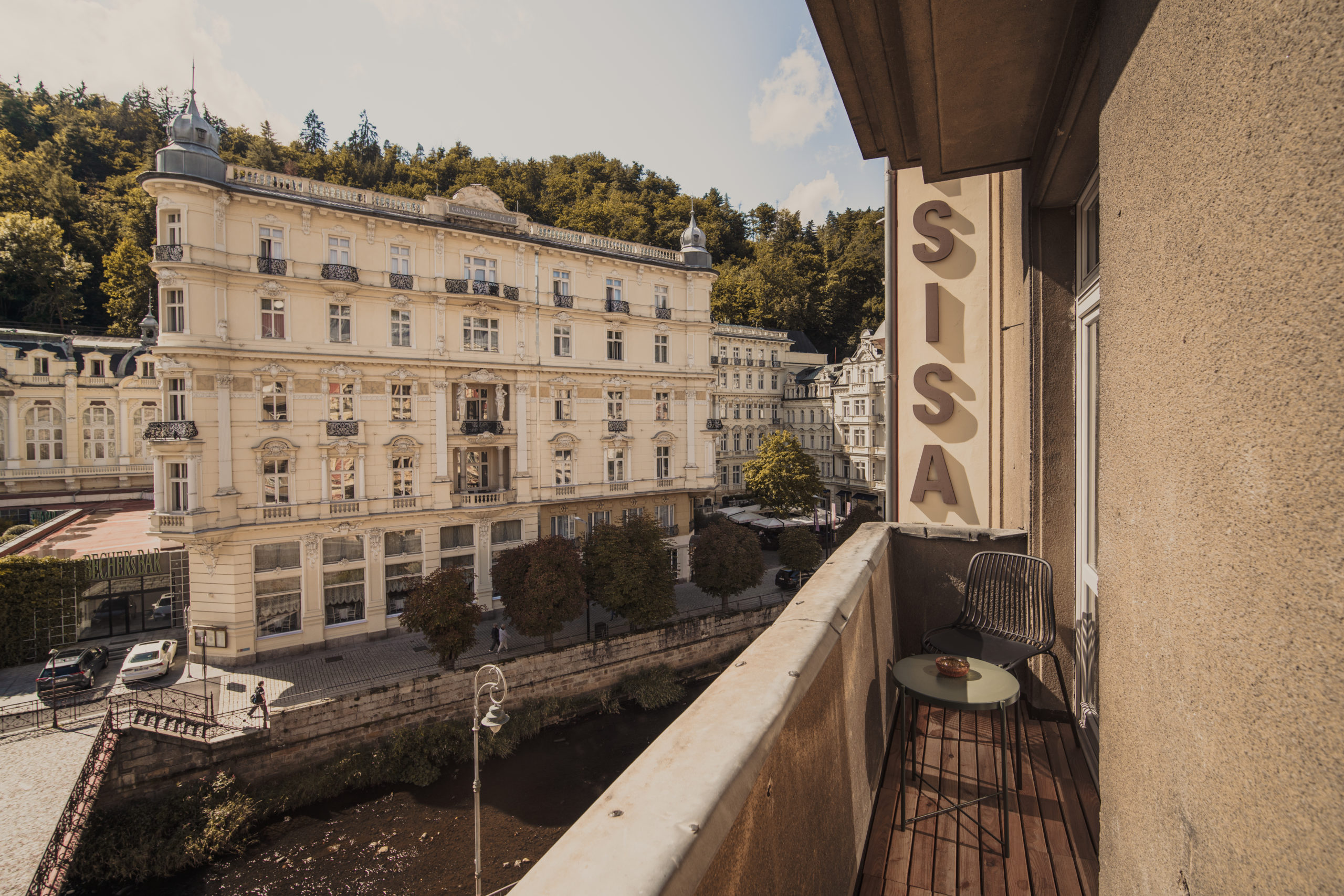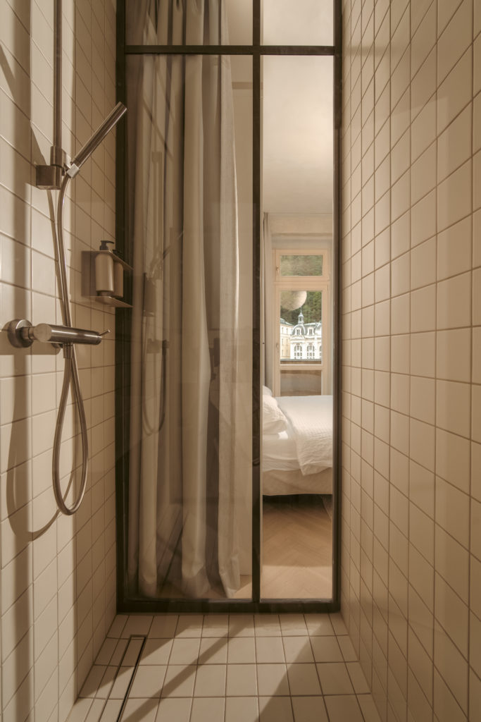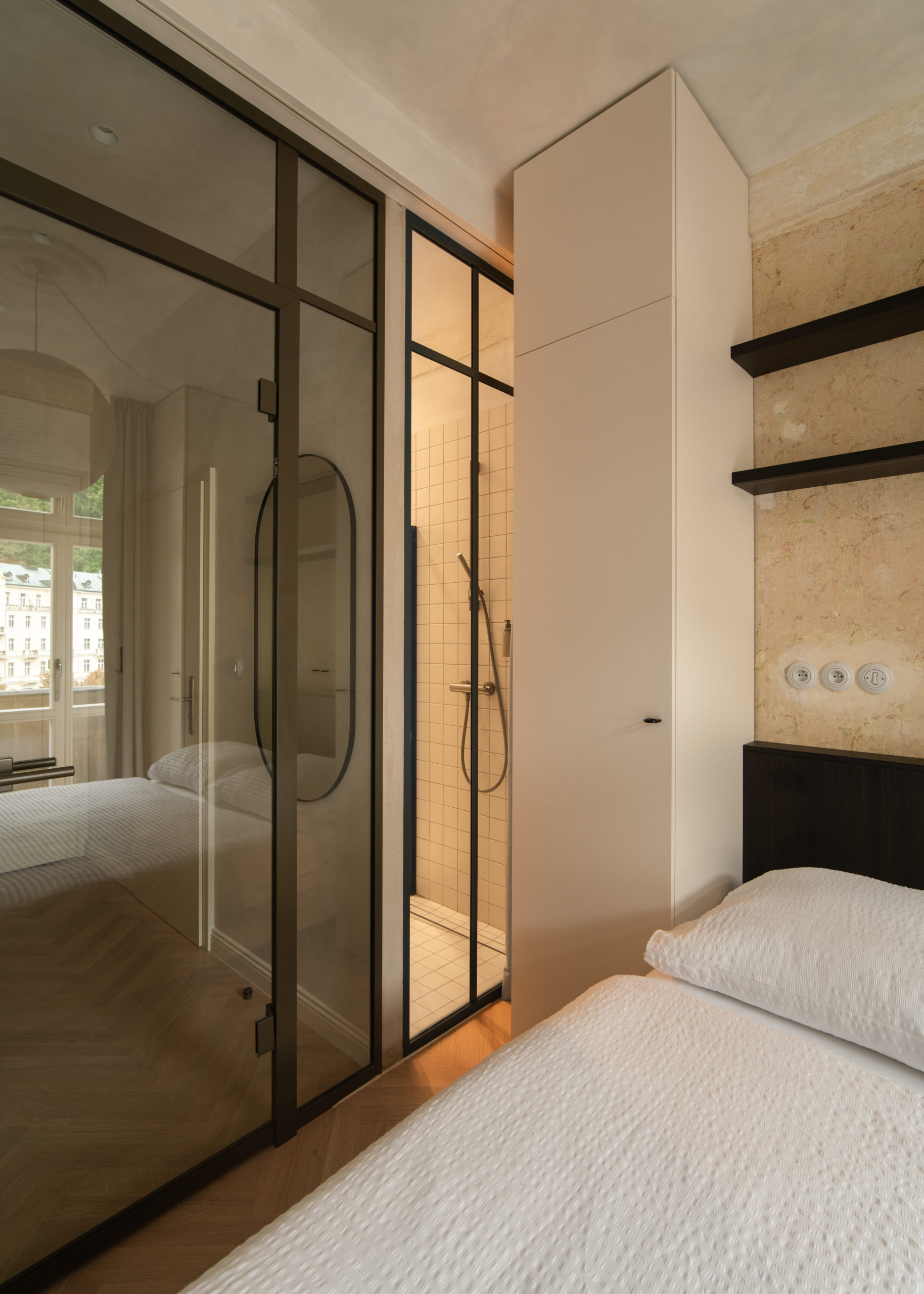 Rekonstrukci bytů s ikonickým výhledem na Grandhotel Pupp jsme pojali jako setkání historie s moderním životem. Velkorysý původní byt jsme rozdělili na tři samostatné jednotky – dvě prostorné 2kk a jednu útulnou 1kk – které dnes slouží jak pro krátkodobé návštěvy, tak i pro delší pobyty. Každý detail jsme navrhli tak, aby uživatelům poskytl plnohodnotné zázemí, a přitom zůstal věrný původnímu duchu místa. Skleněné příčky se subtilním rámováním přinášejí do ložnic i chodeb více světla a při vstupu do apartmánů otevírají výhled na Grandhotel Pupp. Autenticitu interiéru podtrhují repasovaná svítidla, ponechaný dobový nábytek a oškrábané omítky, které odkryly dekorační válečkované nátěry. Parketové dřevěné podlahy odkazují na tradiční historické skladby. Repasované dveře s mosazným kováním a nově vybudované koupelny v moderním standardu propojují minulost s přítomností. Výsledkem je prostor, který má duši – a který si vás získá hned při prvním otevření dveří.