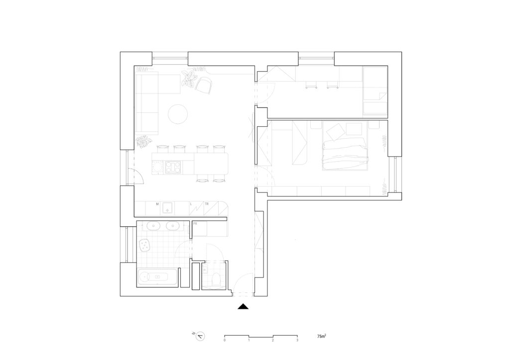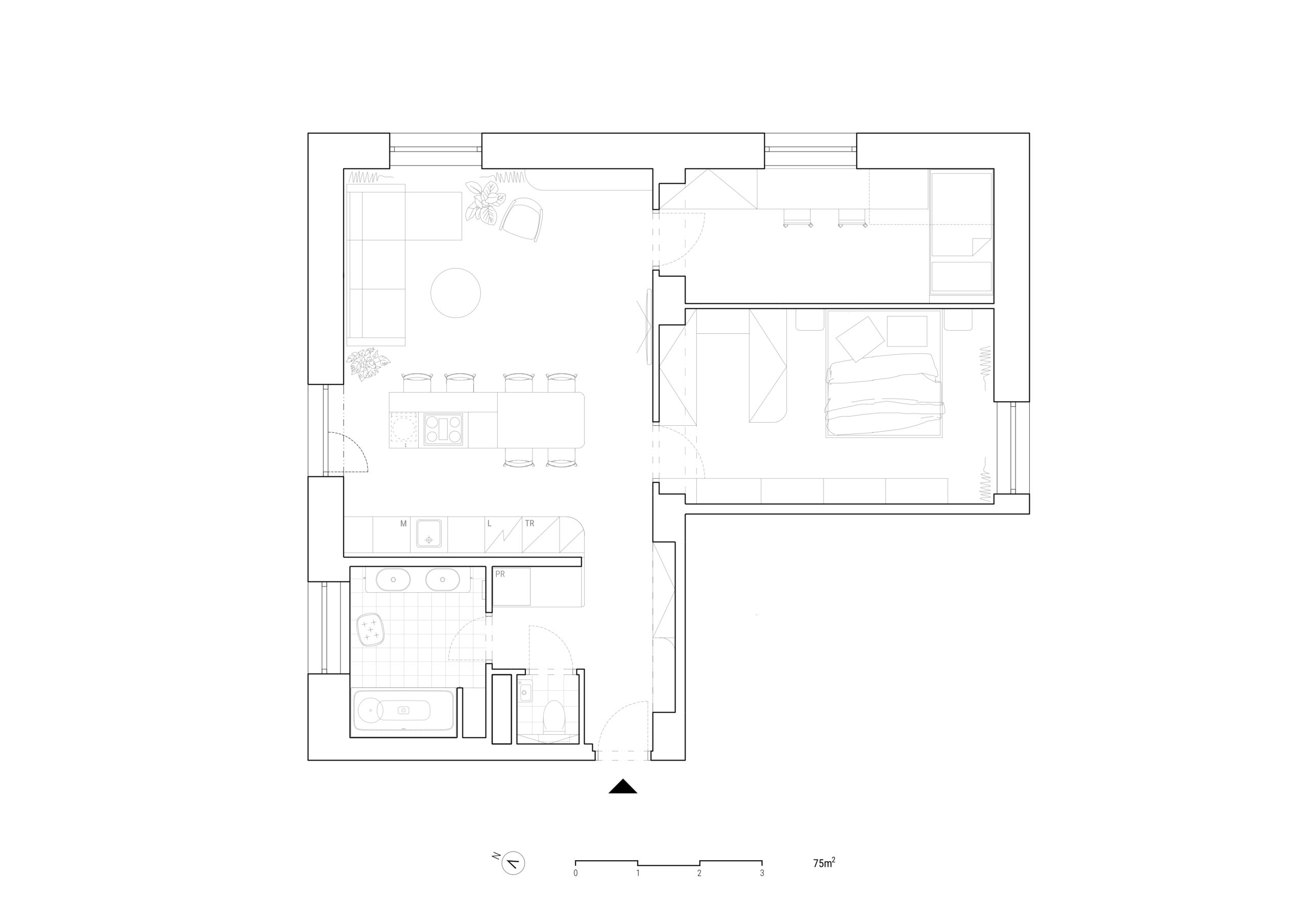 Rekonstrukce bytu v pražských Petřinách proměnila původní dispozici v otevřený a harmonický domov. Odstraněním umakartového jádra vznikl prostorný obývací pokoj s kuchyní, nová koupelna a samostatné WC. Ložnice i dětský pokoj jsou orientovány na jihovýchod, což interiéru dodává dostatek světla a klidu.