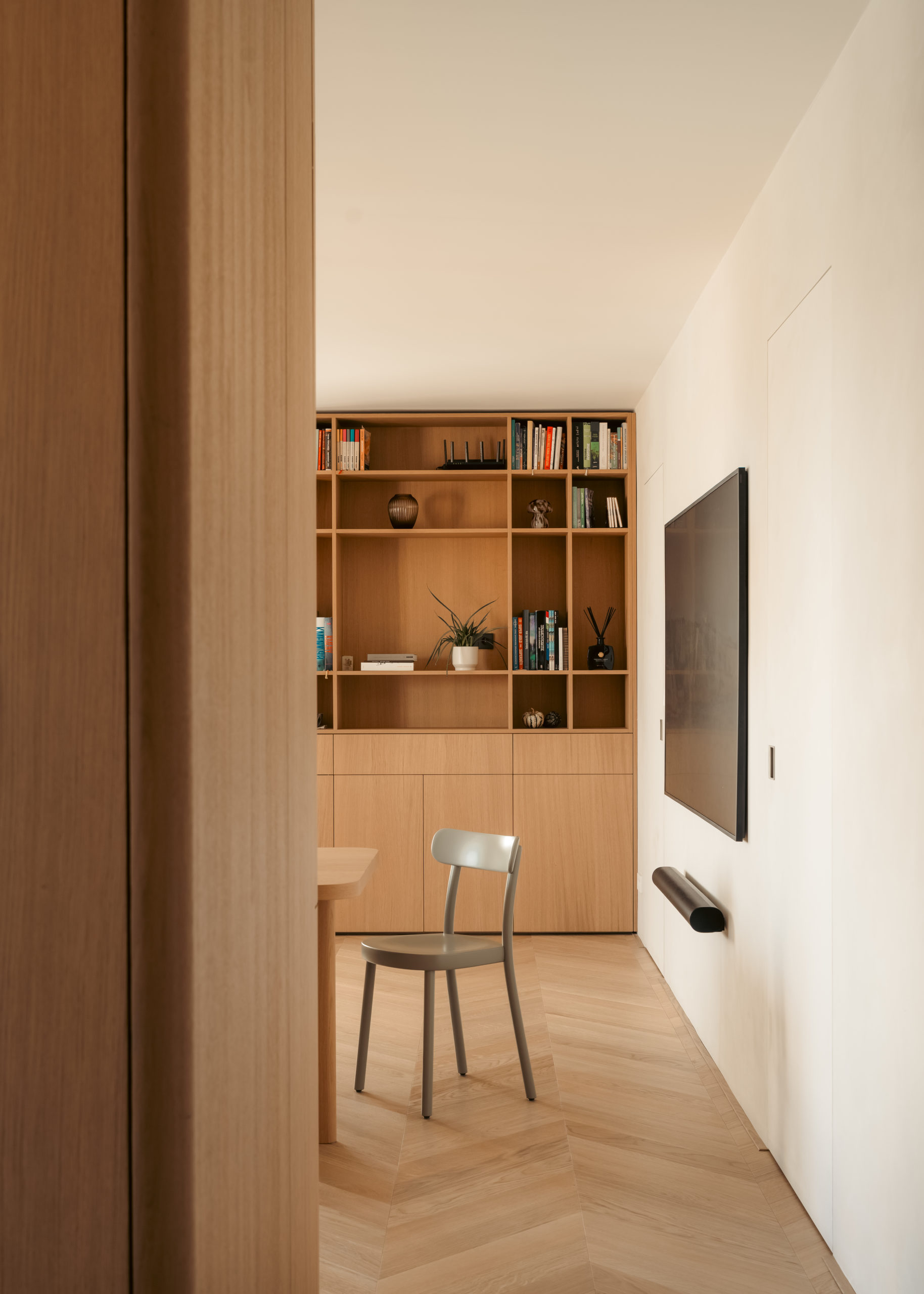 Celý prostor sjednocuje kombinace jemných krémových tónů, dubové dýhy a limewash malby, která dodává stěnám strukturu a hloubku. Na míru navržený nábytek, skryté zárubně a zaoblené tvary podtrhují čistotu a eleganci interiéru. Výsledkem je světlý, funkční a nadčasový byt s přirozenou atmosférou.
